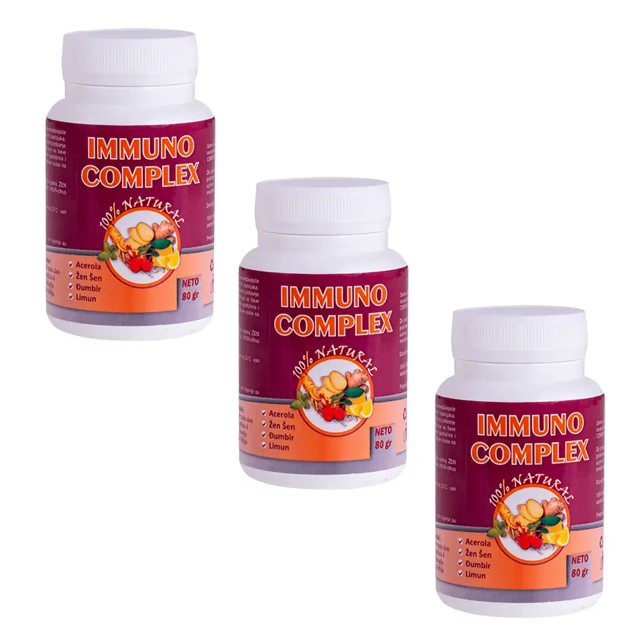 Immuno complex je preparat u obliku praha na bazi 4 biljke: acerole, žen šena, đumbira i limuna.